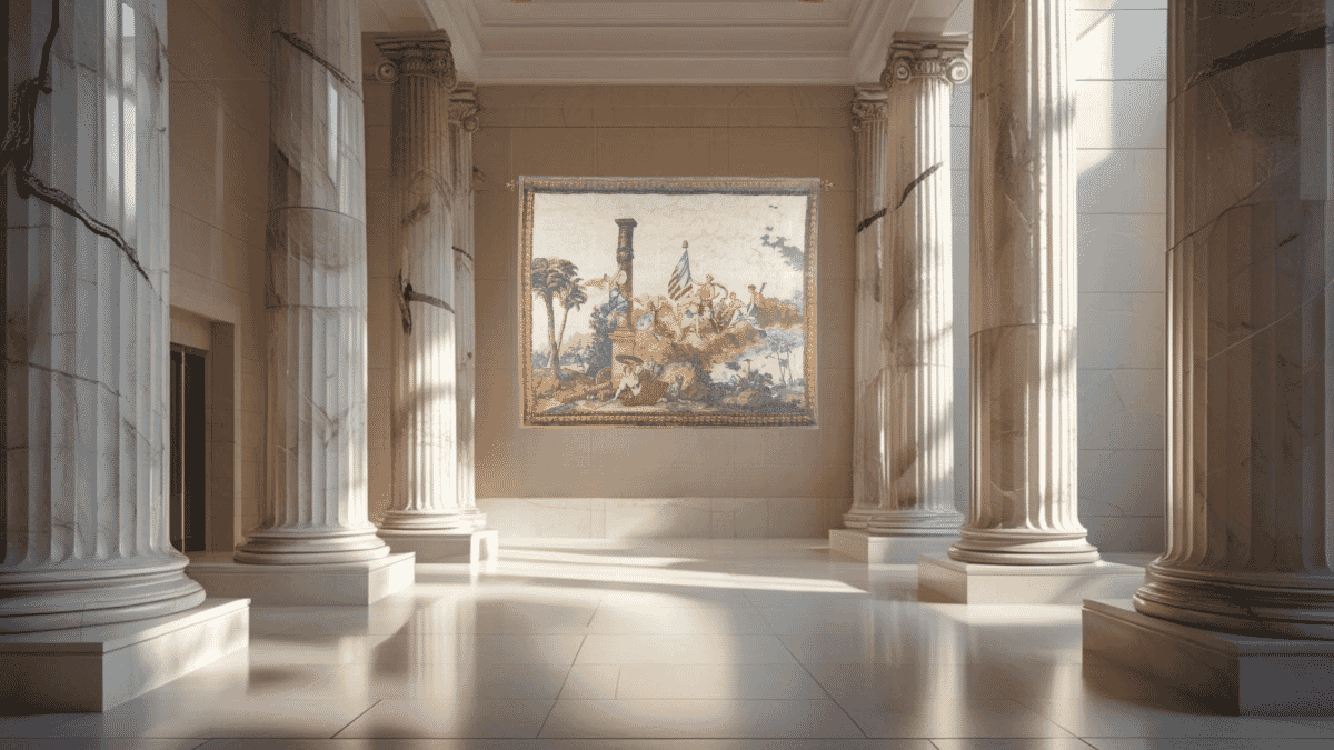 The America tapestry is part of a set commissioned by King Louis XVI that represents the four continents: America, Europe, Asia, and Africa. Made in the late 1700s, it reflects the close ties between France and America during the American Revolution. French and American artists both celebrated the struggle for independence from Britain, with France proud of its important role in supporting the war. This tapestry captures that historic connection and the shared ideals of freedom and alliance between the two nations.
