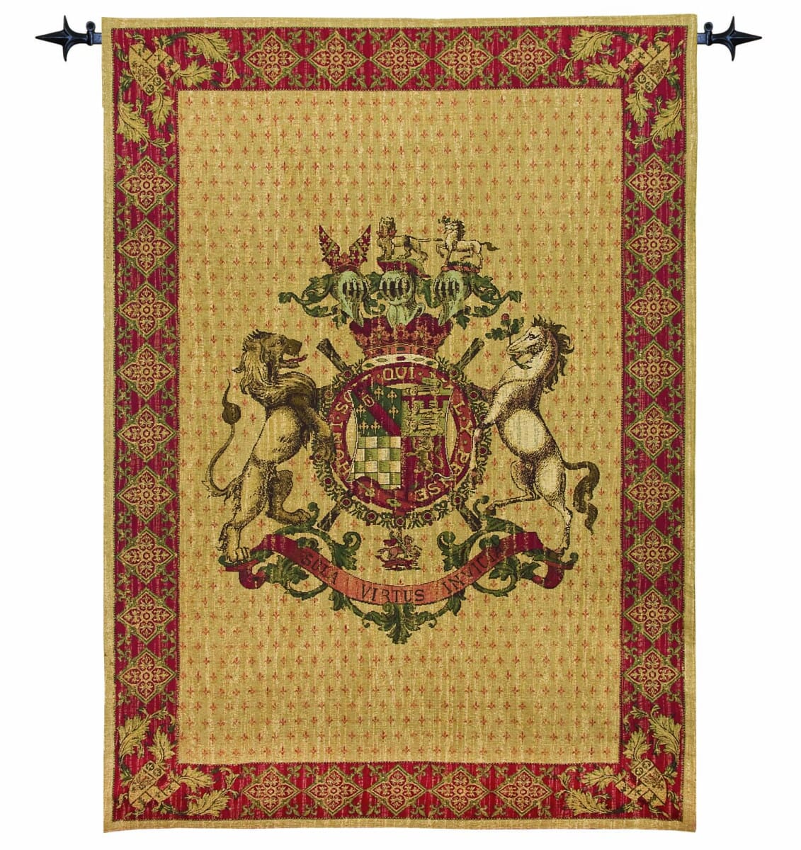 This tapestry features the armorial bearing of a noble knight of the sixteenth century. The Latin translation on the central coat of arms reads HONI SOIT QUI MAL Y PENSE (Shame be to him who evil thinks). The Latin on the lower scroll reads SULA VIRTUS INVICTA (Islands Unconquered Strength).