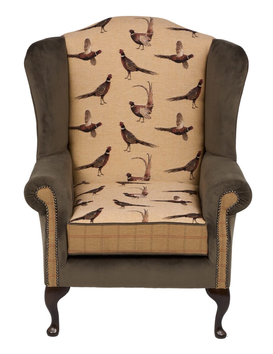 Handcrafted with exquisite attention to detail in the UK, this distinguished wing chair boasts traditional studding and is expertly finished with polished solid beech legs. Its classic design exudes timeless elegance, upholstered in beautiful Country Pheasants tapestry fabric and Country Plaid tapestry fabric, elegantly complemented by mole velvet. Unwind in luxurious comfort, knowing that every aspect of this chair reflects the highest standards of craftsmanship, making it a statement piece that adds a touch of country sophistication to any room. Whether placed in a cosy corner or showcased as a focal point in a living space, this wing chair promises to elevate the ambiance with its refined rustic charm.