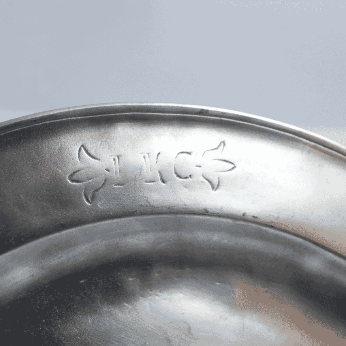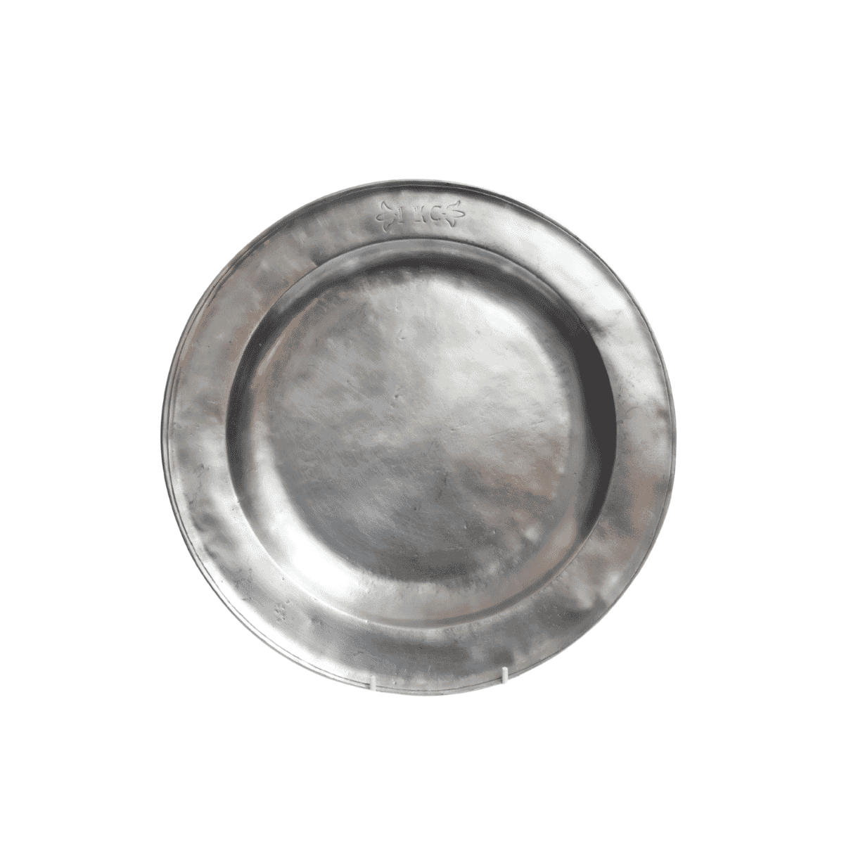 Handcrafted in Italy, this decorative pewter plate features a simple raised rim that highlights its classic form. A subtle I K C engraving at the top adds an artisanal touch. Finished with an antiqued patina, it blends traditional craftsmanship with understated elegance, making it a refined piece for display.