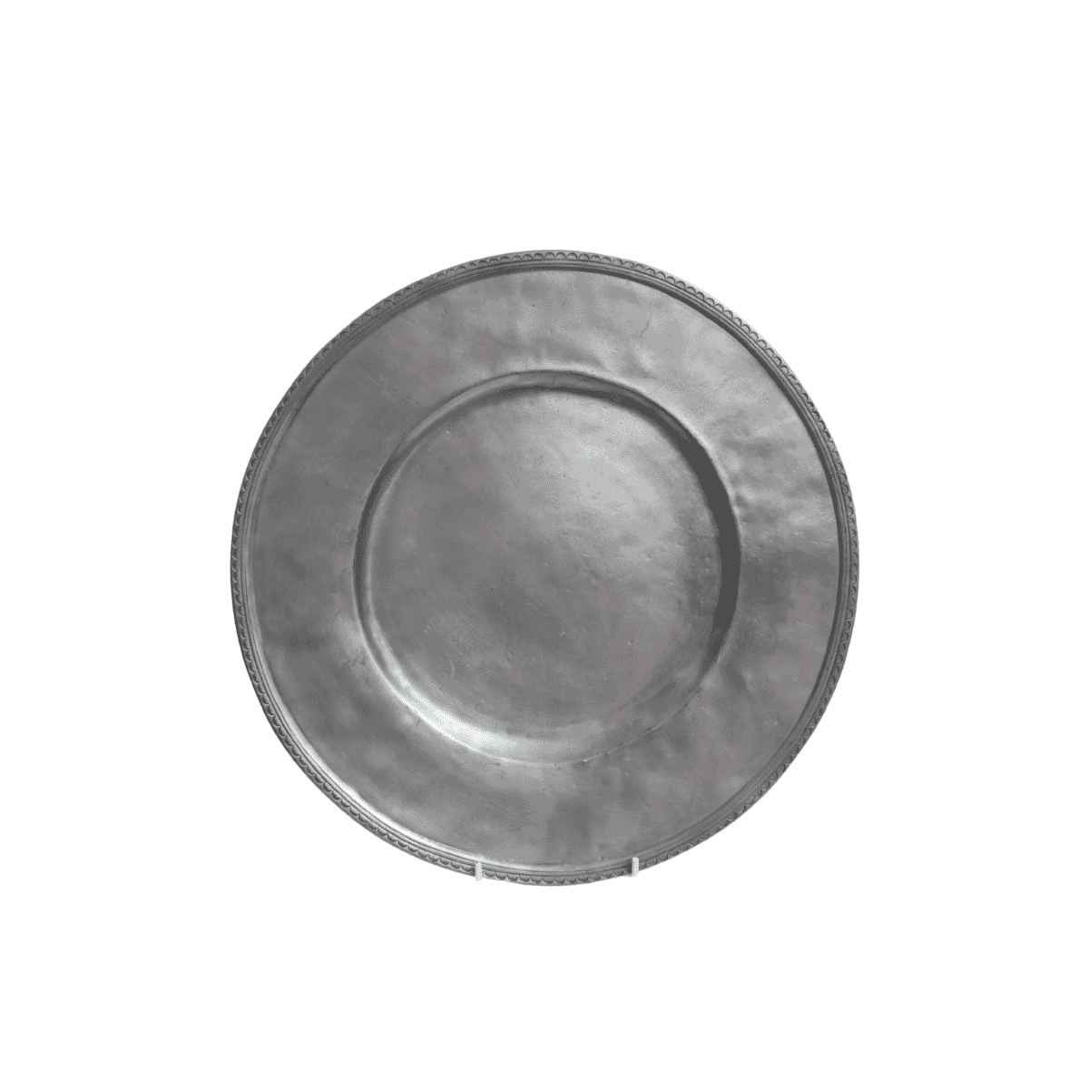 Handcrafted in Italy, this decorative pewter charger features an engraved scallop border that adds a refined touch. Finished with an antiqued patina, it blends traditional craftsmanship with timeless simplicity, making it a beautiful and versatile piece for display.
