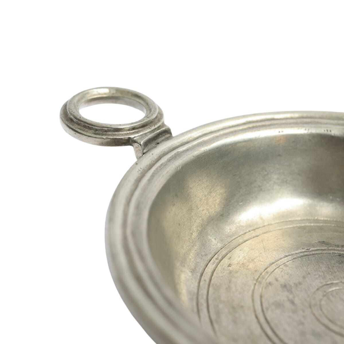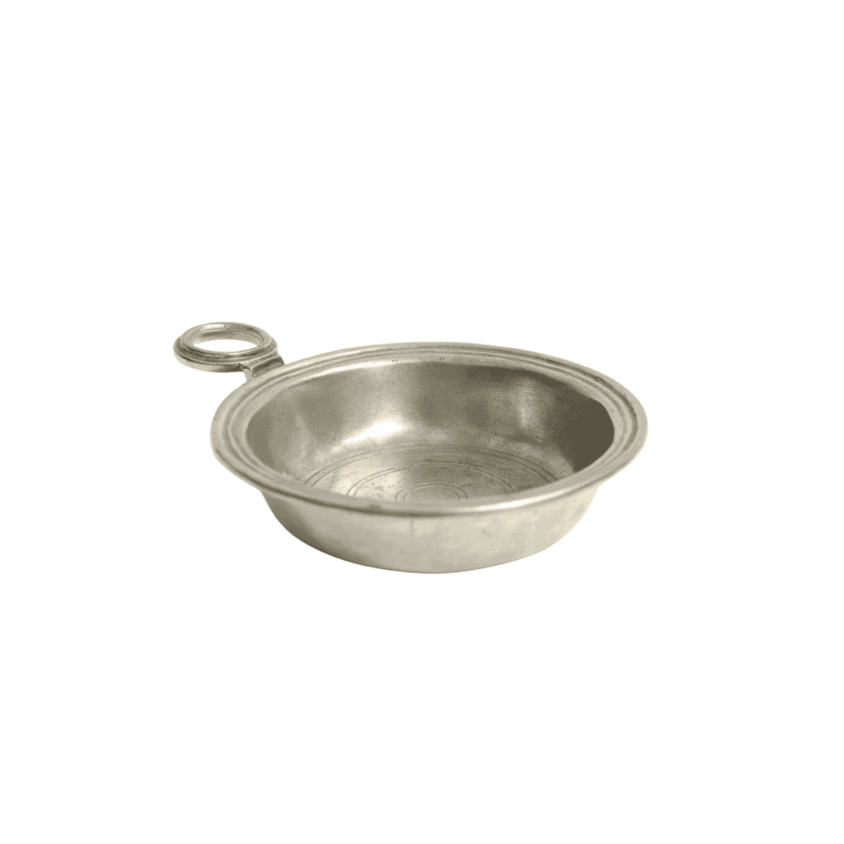 Handcrafted in Italy, this pewter coaster features a simple circular form with a loop handle and subtle concentric engraving details. Its lightly aged finish reflects traditional craftsmanship.