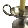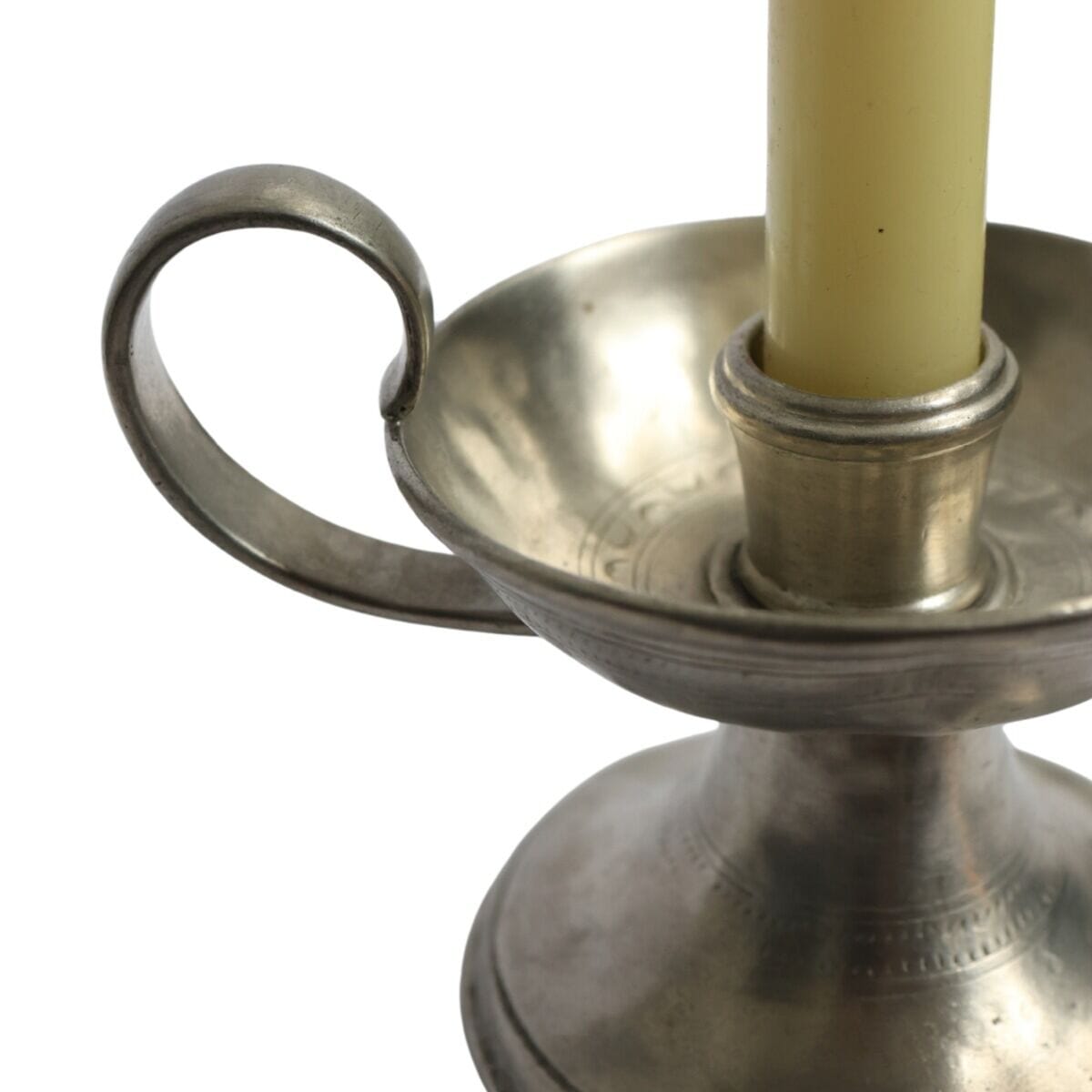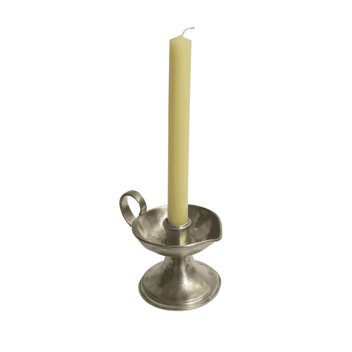 A charming pewter chamber candlestick handcrafted in Italy, featuring a traditional finger loop and gently curved dish to catch candle drips. Finished with an antiqued patina, it brings classic character and warm, old-world elegance to any setting.