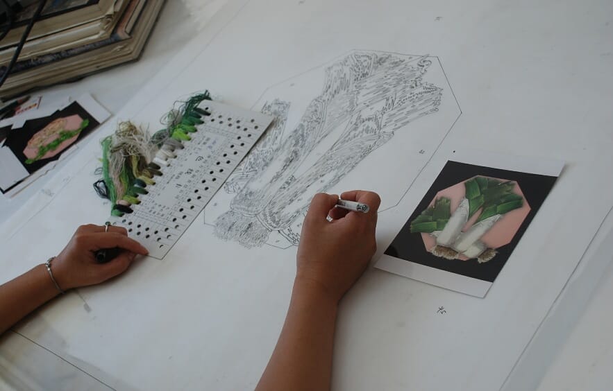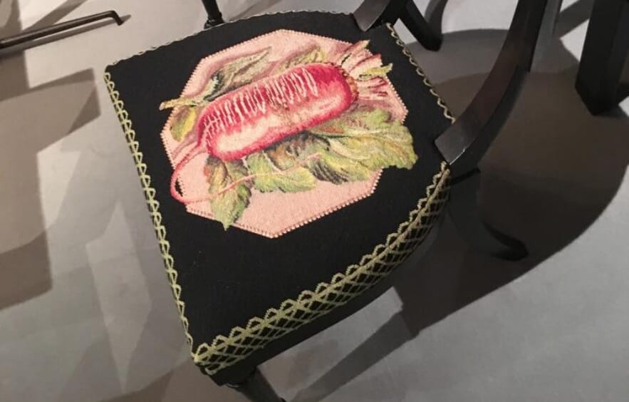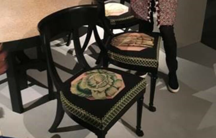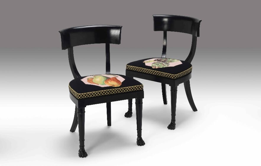 This beautiful set of dining chairs were originally designed by Boutet de Monvel. In 2018, Hines were asked to replicate the designs for a private client. The classic designs were all hand-drawn onto paper cartoons in a long and painstaking process. The cartoons were then placed under the looms and the seat panels woven.