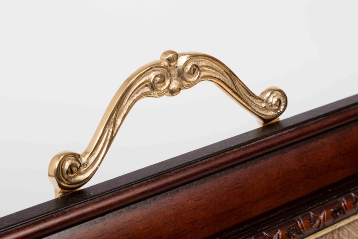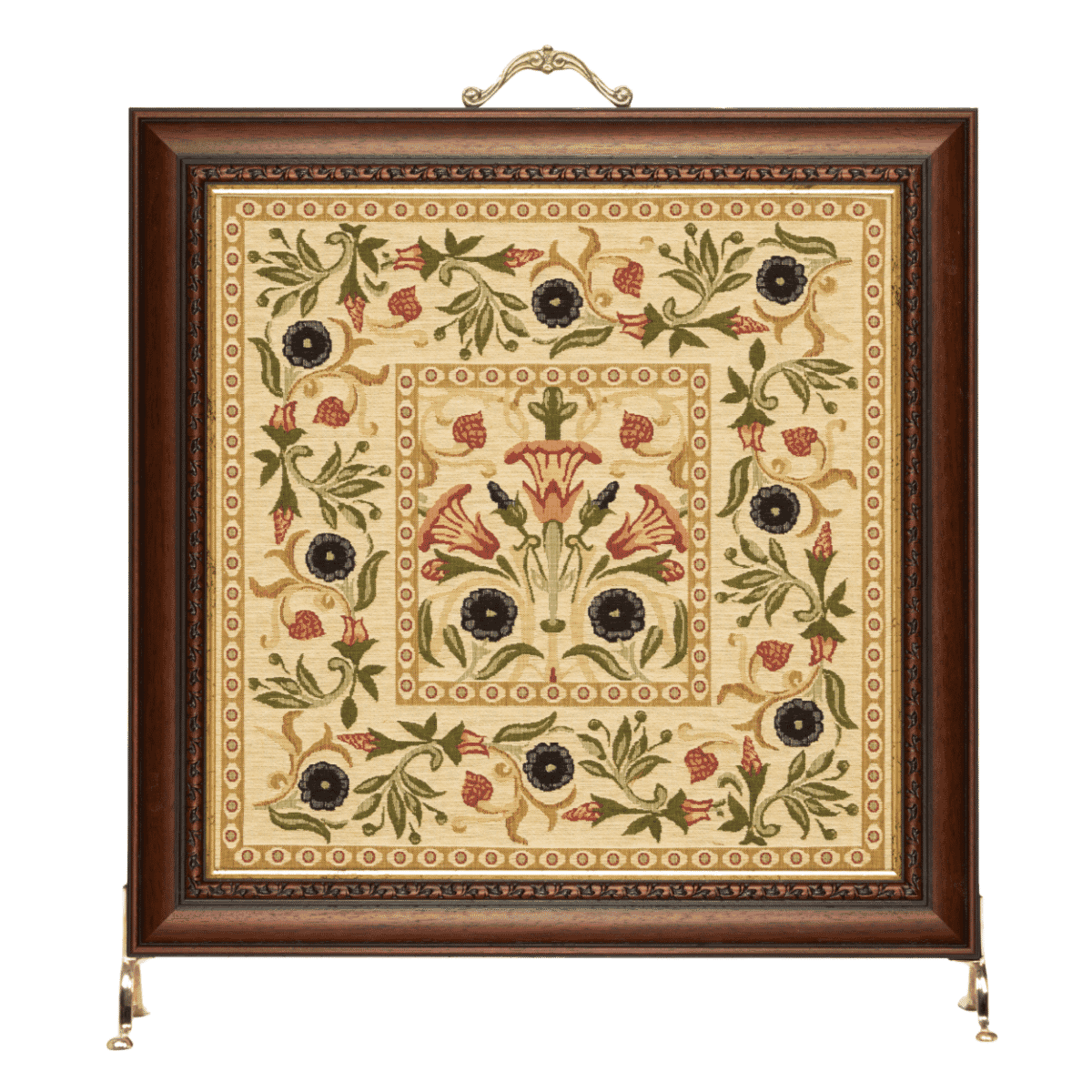 Transform your fireplace into a stunning focal point with this timeless unglazed tapestry firescreen from Hines of Oxford. Featuring beautiful solid brass handles and feet, along with a handcrafted frame made from low-density Ayous hardwood polished in a rich mahogany color with gilt edging on the inner profile, this screen effortlessly makes a bold and eye-catching addition to your home.