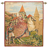 This tapestry portrays Sir Lancelot safeguarding Lady Guinevere as they journey to King Arthur’s court. Woven in rich, regal tones of gold, green, red, and blue, the scene centres on the noble pair with the castle rising in the distance.