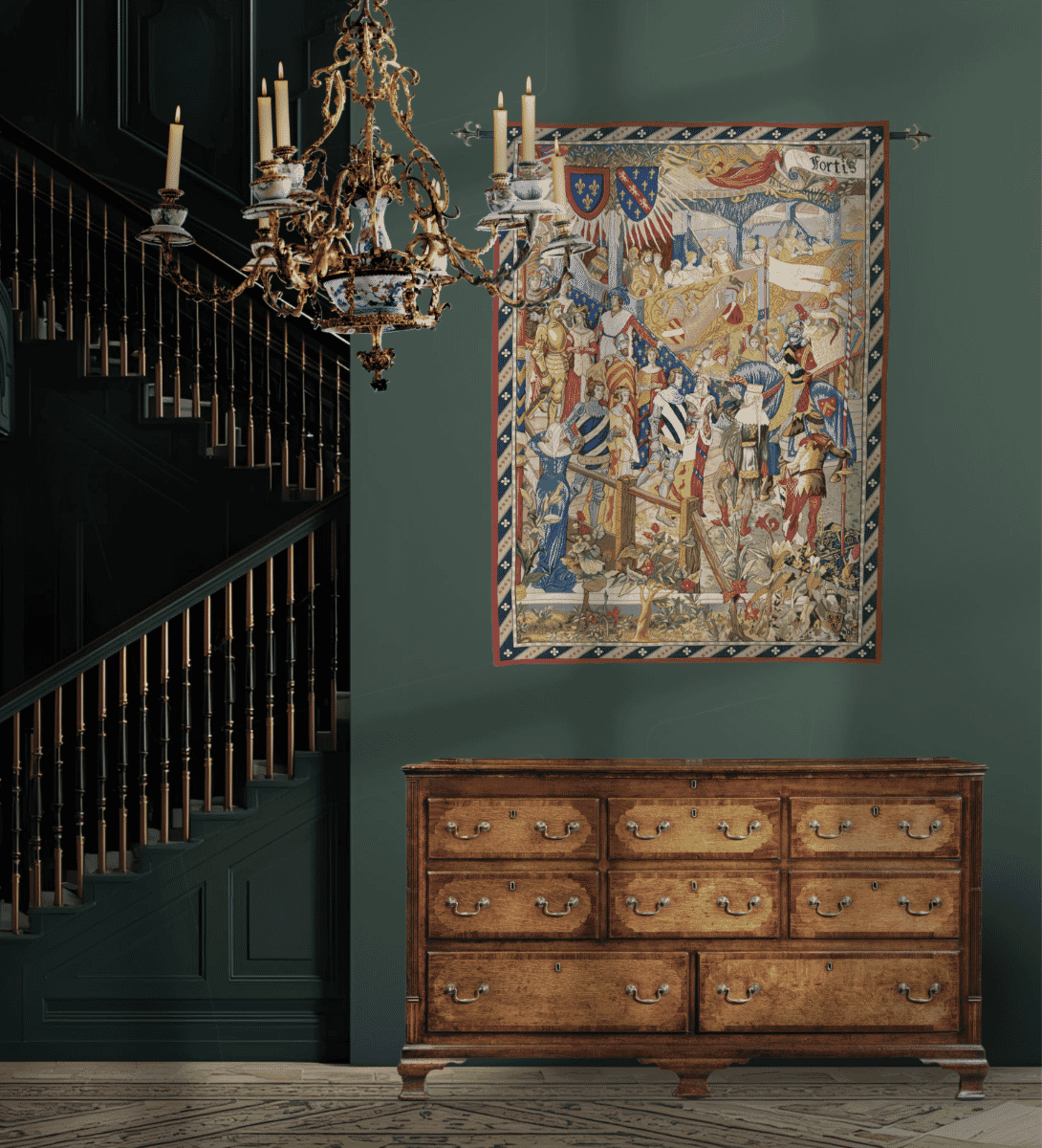 This heraldic tapestry was originally woven at the Royal Gobelins Manufactory in Paris in the late 19th century, and depicts a noble jousting tournament from the end of the 15th Century.
