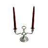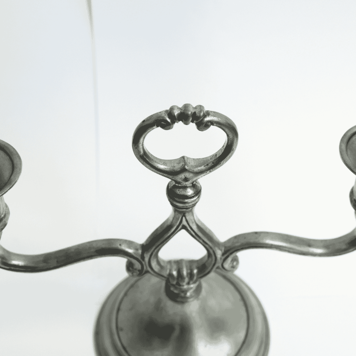 A beautifully shaped two-arm pewter candelabra made in Italy, featuring elegant curved arms and a decorative central loop. Set on a rounded base with traditional detailing, it’s finished with a classic patina that enhances its timeless character. A refined statement piece for any table or mantel.