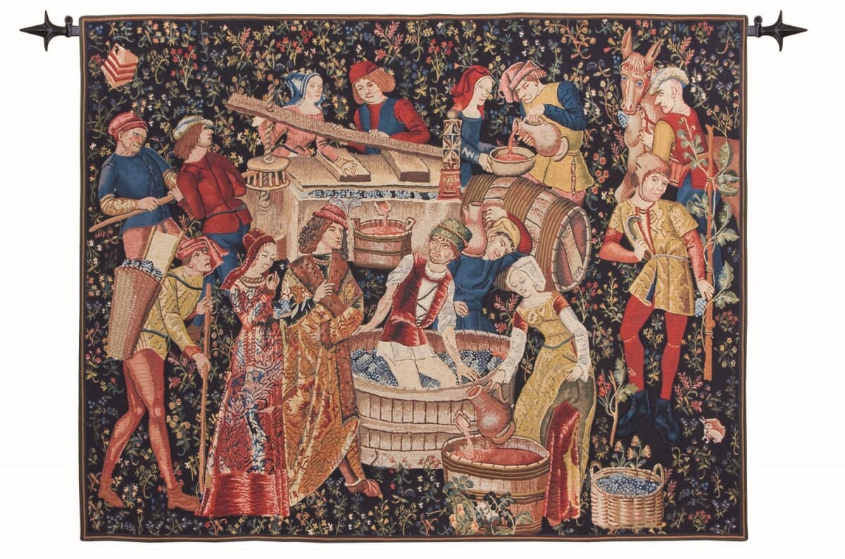 This striking medieval tapestry was woven in the 15th Century on a high-warp (vertical) loom. It originated from Les Ateliers de France, possibly from Burgundy, and was bequeathed by a Madame Edmond Dollfuss in 1930 to the Cluny Museum in Paris where it hangs today. In the Middle Ages, tapestries were almost exclusively commissioned by the nobility, yet they often featured scenes from everyday life including peasant activities. This tapestry depicts the harvesting of grapes, and the pressing and treading into wine. The story is set against a mille-fleurs (thousand flowers) background which was very popular in the 15th Century and was possibly inspired by the custom of strewing cut flowers on the ground on fte days. The Noblewoman in the centre right is about to dip a flagon into the barrel of newly-made wine. The richly dressed couple on the left are inspecting the labours of the peasants whilst the lady tastes the first fruits of the vintage.