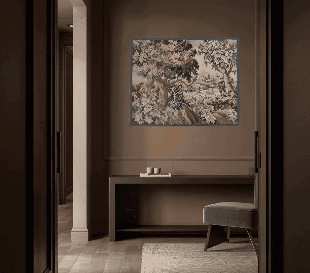 This handwoven tapestry features a peaceful woodland scene with trees, flowing water, and soft natural foliage. Birds rest among the branches while ducks glide across the water, creating a calm and balanced composition. The blend of warm earthy tones with soft blues and greens adds depth and warmth, giving the piece a timeless, decorative feel inspired by traditional verdure designs.